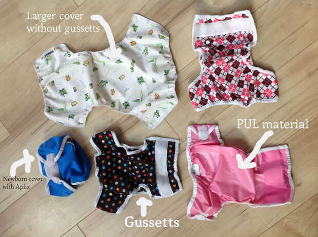 Cubiertas: vea el cuadro 3. Estos normalmente se hacen con PUL y vienen en broches de presión o aplix. También puede ser de un tamaño o puede ser OS y tienen lo que se llama un complemento por ascenso al crecer con el bebé. Éstos se utilizan sobre pisos, prefolds o productos. Algunas cubiertas tienen refuerzos alrededor de las piernas, que son grandes para la protección de fuga mayor.