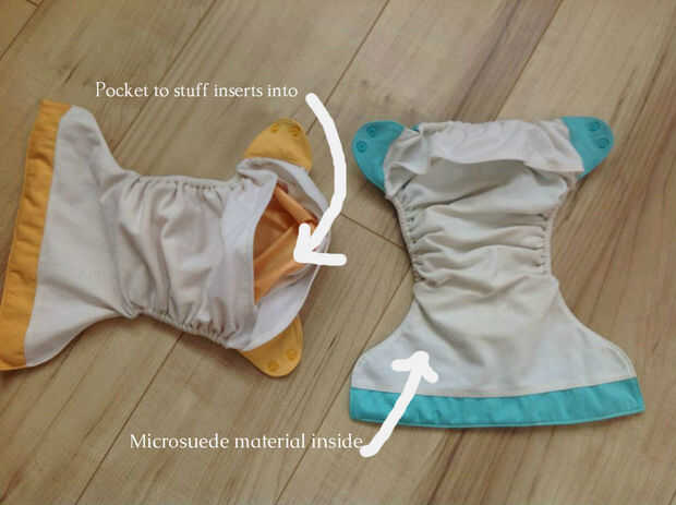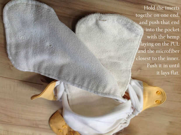 Bolsillos: éstos van al igual que un pañal normal. Éstos tienen un bolsillo literal que usted el inserto en la materia. El relleno absorbe la humedad. Puede agregar más de una inserción para potenciar la capacidad de absorción (a veces llamado un aumentador de presión) como poniendo microfibra sobre un inserto de cáñamo. Quite los insertos y lave todas las partes del pañal. Antes de usar otra vez, tienes que rellenar el pañal, que toma algún tiempo.