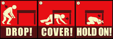 • GOTA, CUBRIRSE Y SUJETARSE. Caer debajo de los muebles robustos. Cubrir tanto de la cabeza y el torso como sea posible. Aferrarse a