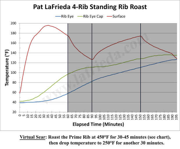 Precalentar el horno a 450° F. Colocar el asado abajo de las costillas en la parrilla de asar, sobre un pan tostado y coloque en el horno. Cocinar a 450° F durante el tiempo que se muestra en la siguiente tabla. Luego, gire el horno a 250 ° F y cocine por 30 minutos. Usted notará en el gráfico que llega a la superficie del asado casi 200° F. Esto es exactamente lo que estamos buscando para producir la reacción de Maillard. Además, esto está muy por encima de la temperatura necesaria para matar cualquier bacteria superficial.