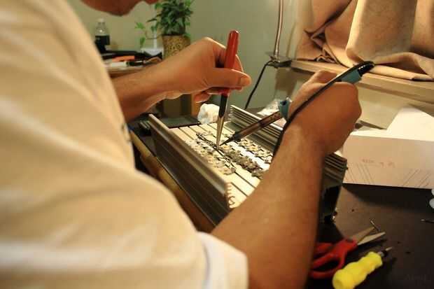 • Para esto traer muy brevemente la punta caliente del soldador en contacto con la placa de conexión previamente estañado de un LED. Esto derretirá la brillante capa de estaño. Tan pronto como esto ocurre sostener el cable con un par de pinzas y empuje suavemente su extremo en el metal fundido y deja que se enfríe. Una vez fría, sostiene el alambre firmemente. Al hacer las conexiones para cada LED se puede probar con el multímetro o con una batería como se mencionó anteriormente. Repita para todos los LEDs.