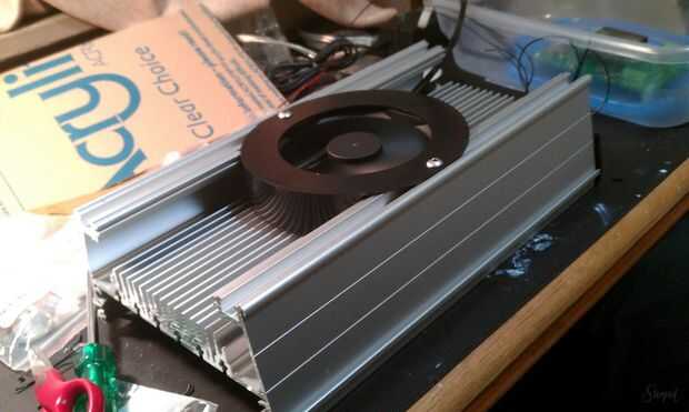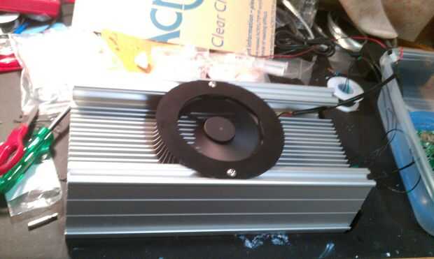 Ahora puede cubrir el LED con la salpicadera. Esto no es más que una hoja de acrílico. Lugar 4 superior ranura en T de tapones y tapas de plástico en cada uno de los lados del disipador de calor. En la parte superior del disipador de calor Coloque el ventilador junto con su marco circular y fijar con tuercas y tornillos. La unidad LED está lista.