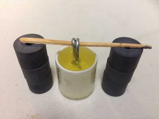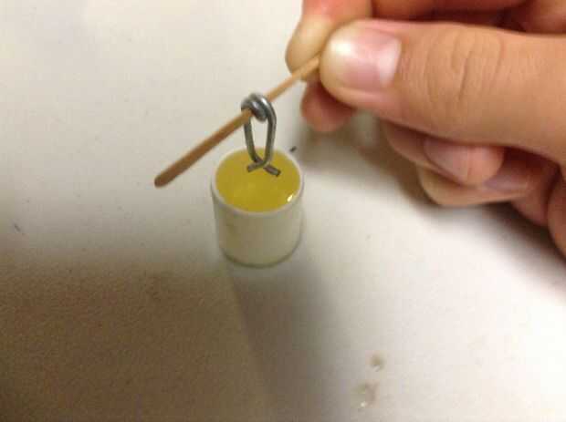 14. Mezcle un pequeño lote de epoxy parte 2 y llene la tapa del palillo de pegamento. Tome el lazo de alambre y suspender con las piernas dentro del resina epoxi y el lazo alrededor de 1/4 de pulgada por encima de la parte superior. Utilice un palillo de dientes y espaciadores para mantenerlo inlace hasta las curas de epoxy. (Este es el pistón de potencia)
