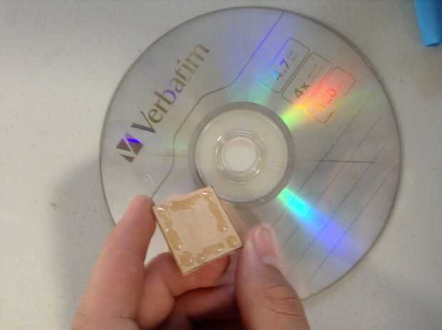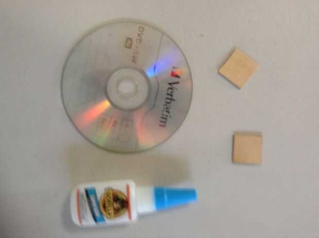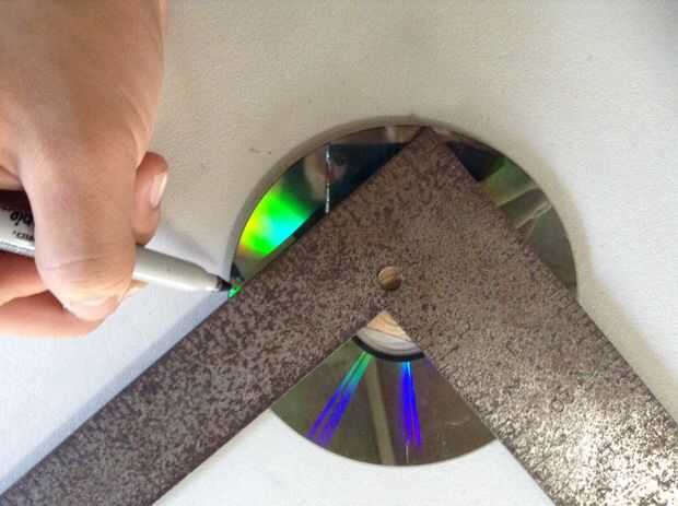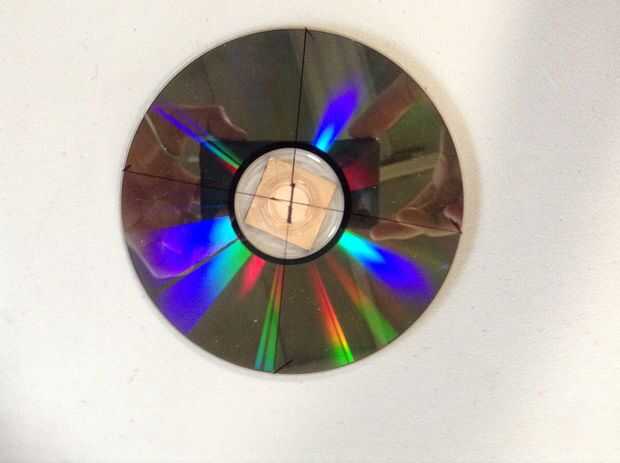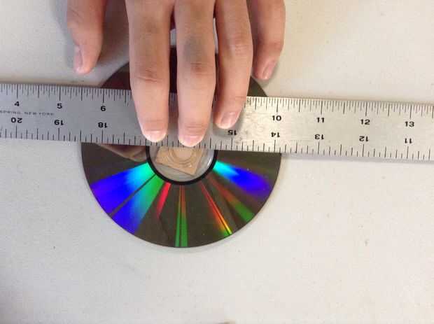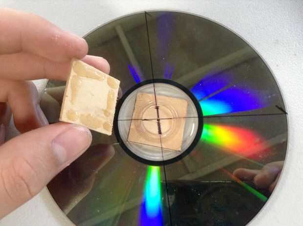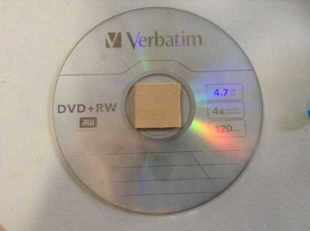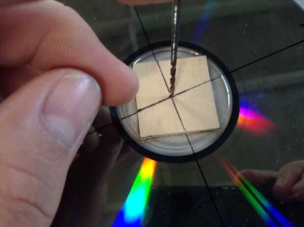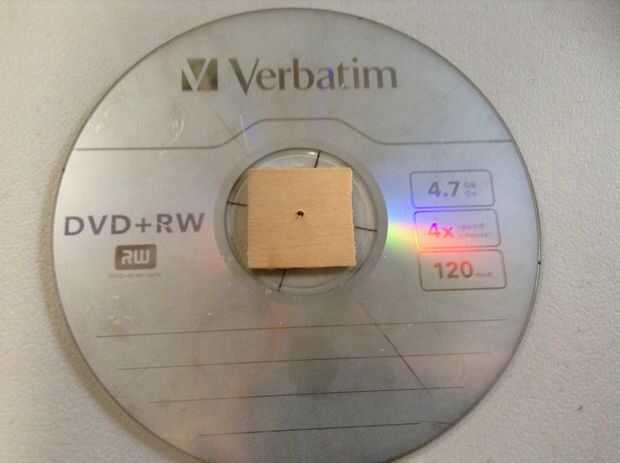 8. Pegue la segunda plaza al otro lado del CD/DVD, marque el centro otra vez y perfore un orificio de 1/16 de pulgada (este es el volante)
