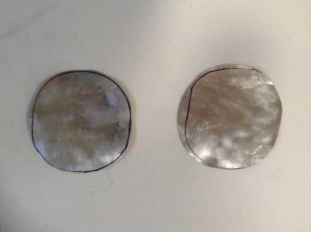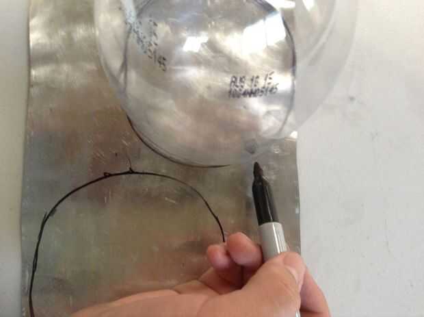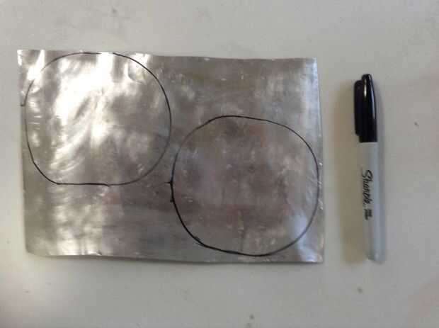 4. marcar 2 círculos en la hoja de aluminio con el resto de la botella de plástico como una plantilla y cortar los círculos, a las afueras de las líneas que marcaste.