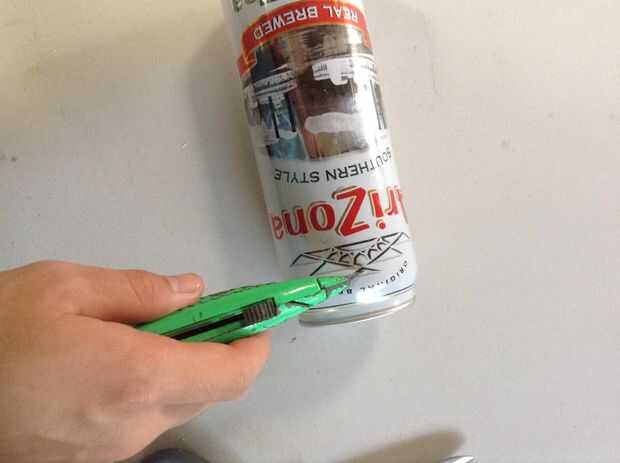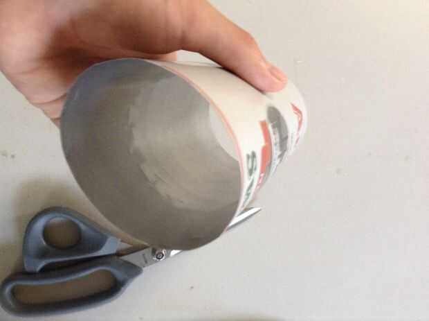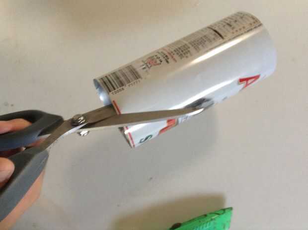 2. Corte la parte superior e inferior de la lata de 23 oz y enderezar el corte con unas tijeras. luego cortar la lata para que usted obtenga una sola hoja de aluminio.