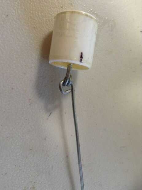 Corte otro pedazo de alambre de aproximadamente 4 pulgadas de largo y poner un lazo en sus extremos y doblar una forma de "Z" en el cable para permitir algunos ajustes. Enganche un lazo en la curva de 90 ° en la varilla de desplazamiento y levante el desplazador sobre a medio camino para arriba. Reforma la Z doble para que el bucle superior es a la misma altura que el alambre suspendido.