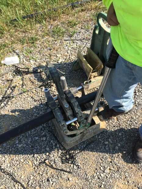 B) colocar una instalación de tuberías HDPE de igual diámetro en el otro lado de los Pit Bull de McElroy. Sujete el accesorio por lo que es lo suficientemente apretada como para deslizarse con la herramienta de deslizamiento en el Pit Bull.