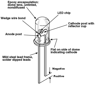 Dentro el LED encontrarás algunas cosas interesantes. Si tienes una carcasa waterclear, puede ver fácilmente cuál es interior. Como ves en la foto, lo primero que notará es los postes del plomo. El LED está en una cubierta de epoxy y los postes del plomo se mantienen seguros por la carcasa de epoxi. Entonces es la Asamblea de semiconductor. En su interior, usted encontrará que hay una taza del reflector. Esto es dirigir la luz desde el chip semiconductor y se salga de la carcasa. Lo puede decir el posetive del LED es que si miras cuidadosamente dentro de, usted puede ver el pequeño poste interno es posetive 'Ánodo' y la más interna es el negativo o el 'cátodo'. El chip semiconductor es un cristal de silicio con una capa química que proporciona los diferentes colores. En algunos LED especial, el tiene varios conjuntos de cystal y un cátodo común o un ánodo común para crear un 'dual' o el 'tri' LED. Ha construido algunos LED en intermitente circuitos para alternar entre los colores. Me gusta esos LEDs RGB (que es lo que se llaman) pero son generalmente más costoso que stndard LEDs.