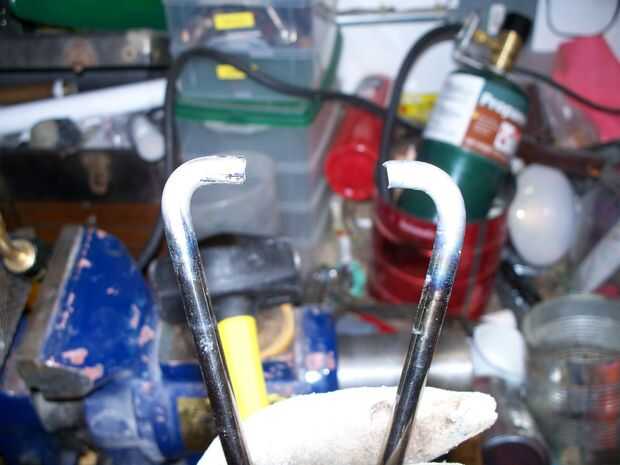 Saciar el metal en algo de agua y calienta los extremos uno a la vez. Doblarlas en por lo que se enfrentan entre sí.