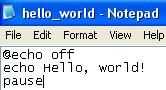 Bueno, su largamente esperado primer archivo vendrá al fin. En él, se imprimirá "Hola, mundo!" en la pantalla. La función para imprimir texto en la pantalla en lote es