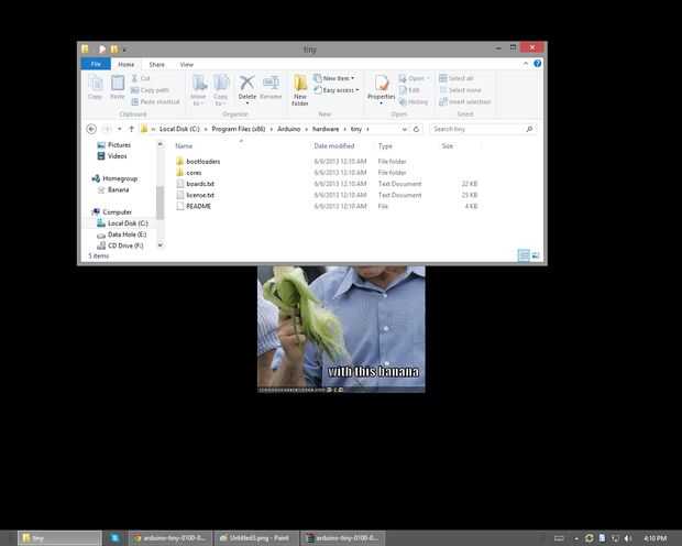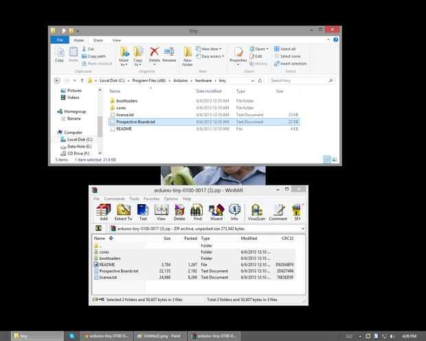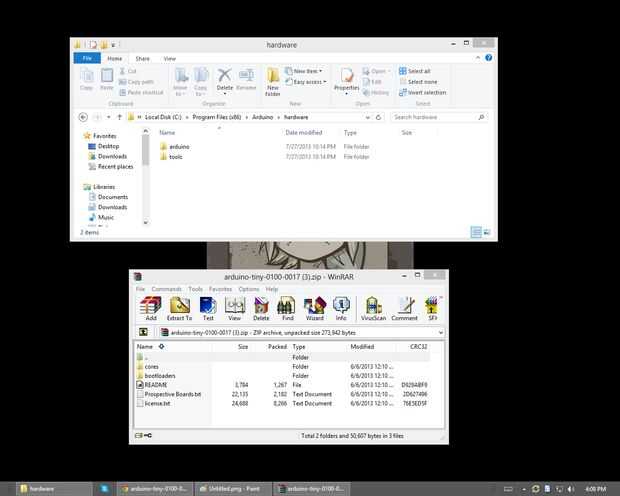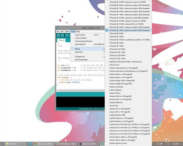 Descargar la última versión del IDE Arduino desde http://arduino.cc/en/Main/Software e instalarlo. Para conseguir que funcione con chips que no sea el ATmega328, tendremos que añadir algunos plugins. Ir a https://code.google.com/p/arduino-tiny/ y descargar la última postal de Arduino-tiny. Vaya a "C: /(Your install directory)/Arduino/hardware" y crear una nueva carpeta llamada "minúscula". Descomprimir el contenido del pequeño arduino en esta carpeta y renombrar el archivo llamado "Boards.txt posible" a "boards.txt".