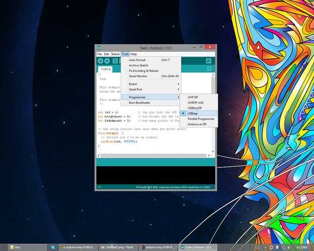 Entonces, abrir el IDE de Arduino. En primer lugar, vaya a herramientas -> Programador y seleccionar el programador de la lista desplegable. Luego, vaya a herramientas -> tablas y seleccione el chip que desee programar. Puede haber varias versiones del chip de la misma; Asegúrese de que selecciona la versión de "1 MHz", como chips de fábrica están ajustados para funcionar a esa frecuencia fuera de la caja.