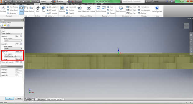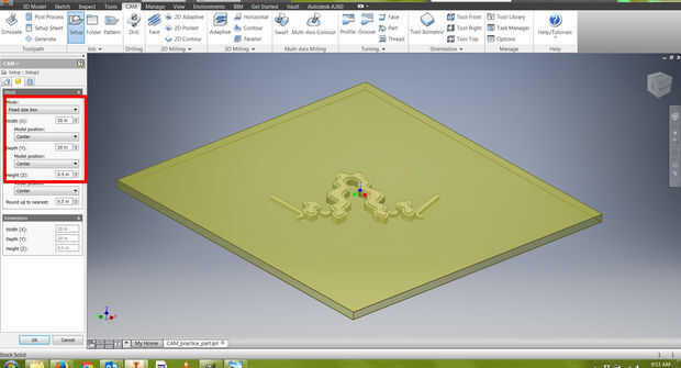 3. durante la fase de configuración, nosotros determinaremos el tamaño de nuestra acción, la situación de nuestra parte dentro de nuestro stock y la ubicación de nuestro sistema de coordenadas de trabajo (WCS). El sistema de coordenadas de trabajo permite al programador programar la parte de la máquina y dice la máquina CNC donde la parte se encuentra en la envoltura de mecanizado. Aunque es una práctica común para los WCS (indicados por la x, y, tríada de z) en un rincón de su stock, para esta operación vamos a asumir que estamos moliendo en una 1/2" pieza gruesa de material chapa, MDF, madera contrachapada o corian. Porque no sabemos donde se encuentra nuestra parte en esta hoja, y porque podemos moler varias veces de la misma hoja, vamos a configurar nuestros WCS en el centro de la parte. Asegúrese de que orientación a la orientación del modelo y origen se establece en el punto de la caja de valores.
