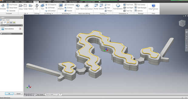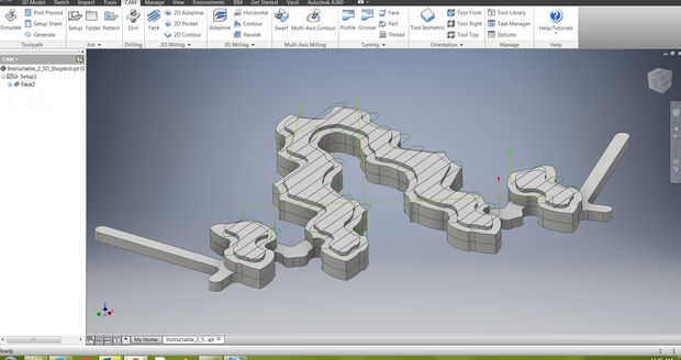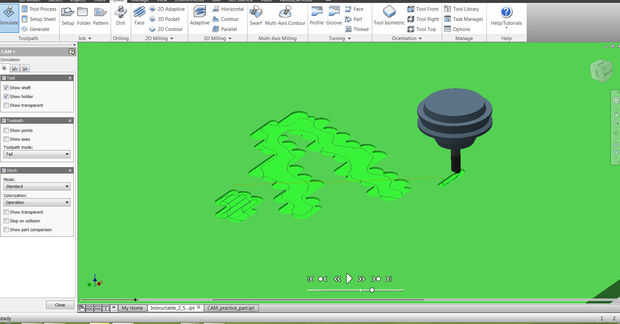 6. ahora quieren simular la trayectoria de herramienta para verificar que es correcta. Haga clic en configuración en el árbol de la característica de CAM y haga clic en simular en la cinta anterior. Utilice el modo de trayectoria de herramienta "Cola," activar su acción en el modo estándar y utilizar coloración: operación al principio, alternando entre valores transparentes y opacas. Panorámica y zoom alrededor del modelo que ven la simulación, observando cuidadosamente la ruta de la fresa. Preste especial atención a los lugares donde la herramienta entra en y sale de su material y visualizar cómo tu acción va a sujetarse a su Junta de spoiler. ¿Si está utilizando abrazaderas, será que está cerca la trayectoria de herramienta? ¿Si estás usando tornillos para sostener la pieza hacia abajo, hay una posibilidad de que la fresa se choca con ellos? Si debe tener tornillos cerca de su parte, puede utilizar tornillos de latón, que son más suaves y no dañinos para herramientas CNC. Si la herramienta se ilumina en roja en cualquier momento, o ver marcas rojas en la línea de tiempo en la parte inferior de la pantalla, el software ha detectado una colisión (entre el stock y soporte de la herramienta o la herramienta desciende por debajo de la parte superior de sus flautas, donde ya no puede cortar). En este caso, usted necesitará salir de la simulación y haga clic derecho sobre tu trayectoria para editarlo. Puede que necesite una herramienta más.