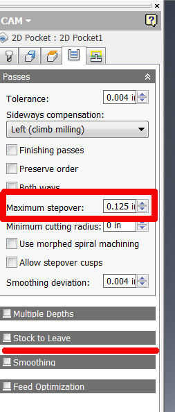 5. en la ficha pasos, cambiar el ancho de paso máximo a 0.125", que es el 50% del diámetro de la herramienta que estamos utilizando. También desactive "Stock que dejo" que asegura que esta trayectoria no dejará ninguna acción. Esta trayectoria va a servir como un desbaste y acabado de pasar.