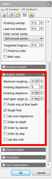 6. en la ficha pasos, haga clic en "Múltiples profundidades" y elija un máximo desbaste paso descendente de 0.125".
