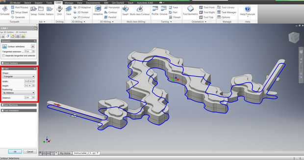 4. Seleccione la geometría del contorno. A continuación, haga clic en el cuadro de "Pestañas" para crear pestañas para sujetar la pieza en posición durante este contorno final. De lo contrario, la parte conseguiría suelta en la acción mientras que la fresa está moviendo todavía--la parte podría ir volando, atascada o dañada, o se podría dañar el molino de extremo. Para la forma, elija fichas triangulares, 0,25" amplia y 0,1" de alto, colocados a una distancia de 2".