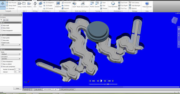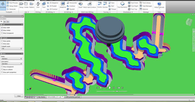 8. Haga clic en configuración en el árbol de la característica de CAM y haga clic en simular en la cinta anterior. Jugar la simulación para verificar sus trayectorias. Ahora que el toolpathing haya terminado, haga clic en "Mostrar parte de comparación" para ver si cualquier cosa necesita a mecanizarse. Cualquier acción restantes se vuelve azul.