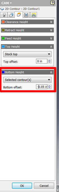 5. en la ficha de alturas, con altura inferior, elija un desplazamiento inferior de -0,05 ". Esto asegurará que la fresa va todo el camino a través de la parte y ligeramente en el tablero de spoiler a continuación, evitar una "piel fina" o intermitente aparezca en el borde inferior de la parte.