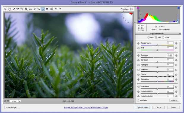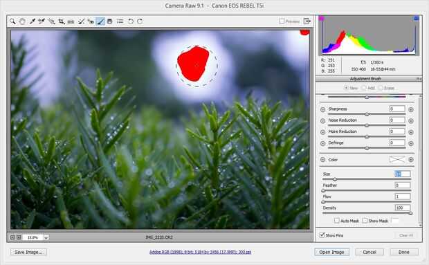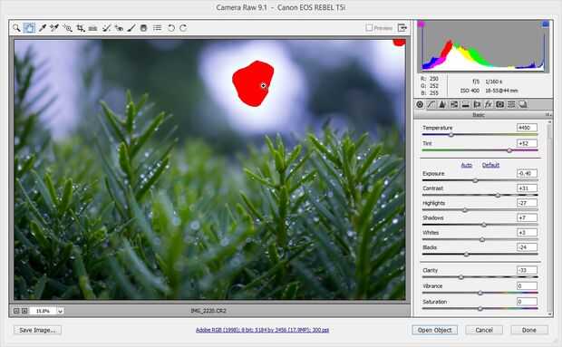 Una vez usted haga clic en él, algunas partes de la imagen cambiará a rojos (asumiendo que usted está usando esta imagen - si no, entonces no podría ver cualquier rojo, en ese caso, estás bien). Estos rojos bits Mostrar donde los puntos destacados están soplados hacia fuera - básicamente donde la imagen es tan brillante que el detalle que no es visible. Para corregir esto, utilizaremos el pincel de ajuste. El pincel de ajuste es una manera de hacer cambios locales frente a los cambios globales , los cambios que realice sólo afectan a las zonas que desee.
