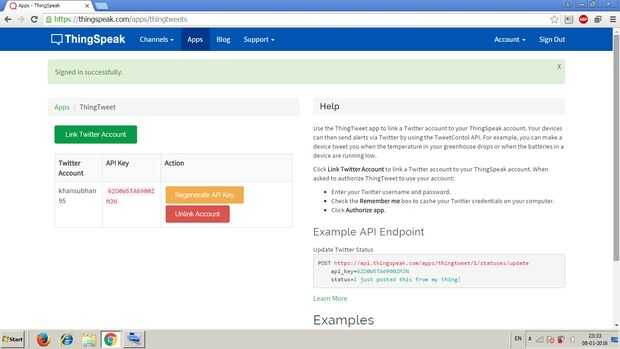 Aquí después de la aplicación de ThingTweet se ha utilizado para vincular una cuenta de Twitter a tu cuenta de ThingSpeak, puede enviar un tweet con la API TweetContol.