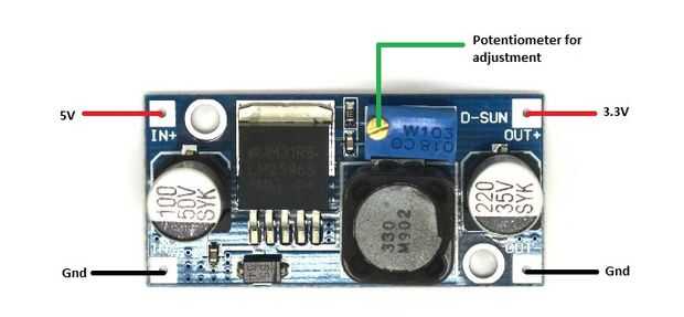 O puede utilizar LM2596 paso dc-dc convertidor. Estas son muy cheap.and he utilizado estos. Dar 5V de Arduino a la entrada. Ajuste el potenciómetro en el módulo, hasta la salida de 3.3V. Encontré que la ESP puede alimentarse con una de estas horas. Realice las conexiones como se muestra en la figura.
