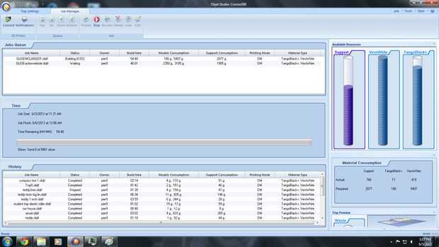 Entonces, el equipo va a cambiar desde la pestaña de "Configuración de la bandeja" a la pestaña "Administrador de trabajo", donde se puede ver si hay otro proyecto en 3D impresión antes tuyo, el tiempo de la impresión 3D, cuánto material se necesita y cuánto material el objeto tiene en reserva.