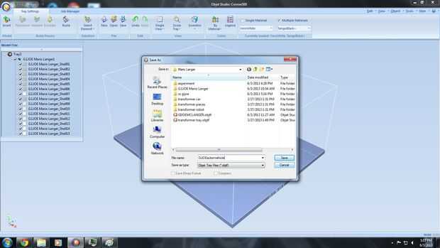 Luego, aparecerá una nueva ventana, pidiéndole que guarde su proyecto como un archivo de bandeja de Objet (*.objtf). El nombre y guárdelo. ¿La razón? El archivo imprimible en 3D no es lo mismo el diseño archivo de, por lo que necesita para crear esta nueva.