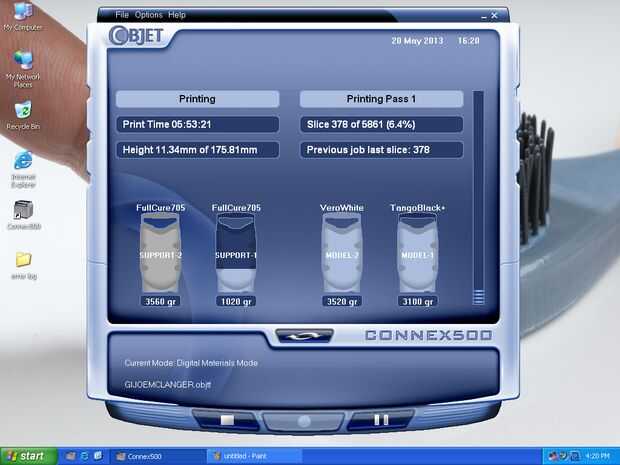 Ahora tipo en el teclado dos veces "Bloq Despl" y una vez «Enter» para cambiar desde el ordenador principal a la vista del ordenador Objet (hacer esto otra vez cuando usted necesita volver a la computadora principal). Usted verá la ventana de objeto, mostrando cuánto material tiene en el objeto y tres opciones: una para detener el 3D impresión, uno para comenzar la impresión 3D y uno para pausar la impresión 3D. Haga clic en el icono de impresión 3D de inicio (círculo).