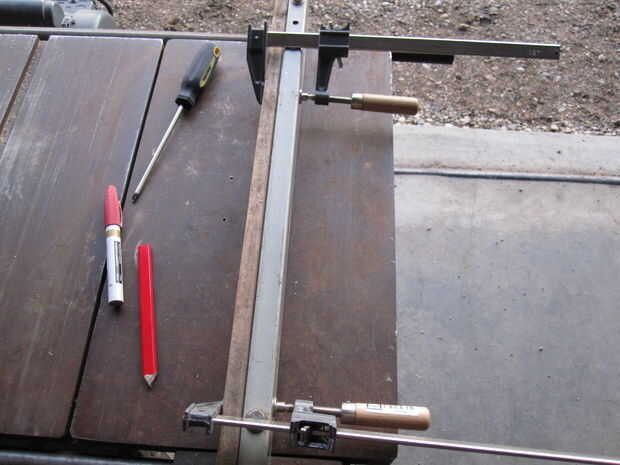 Ate el pedazo de madera a la guía de corte con un par de abrazaderas de tipo C, asegurándose de que la madera se desplaza unos milímetros por encima de la mesa. Si la madera está arqueada, puesto la curva hacia el exterior para que los extremos de la placa toquen el tope lateral. Esto hará que el arco desaparece cuando usted apriete el tornillo de mediano. A continuación se que necesita para marcar los agujeros de alguna manera. Podría medir a las mismas longitudes de la madera, pero su más fácil y más exacto para marcar los agujeros. Usé un destornillador punta afilado y penetra en la madera a lo.