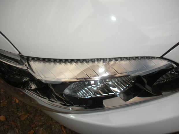 Ahora puede retirar el respaldo de la cinta de 3m y aplicar la forma que desea para su linterna. Seguí la línea grabada en el faro con mi LED porque fluye perfectamente con la campana.