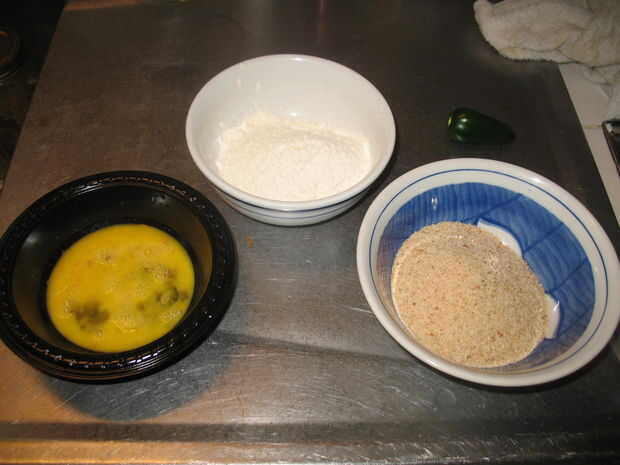 DIP el popper montado en huevo, luego harina, luego huevo, luego pan rallado. Reapply huevo y pan rallado a calvas.