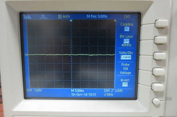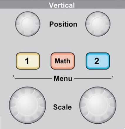 Pulsando la tecla suave de Volts/Div (se muestra en la tercer imagen) puede seleccionar para la perilla de escala dar curso o ajustes finos de la escala vertical (AKA la vertical voltios/división). Una división es una de las líneas de puntos blancas en la pantalla. 5 voltios/Div significa que cada línea horizontal indica un cambio de 5 V de la línea horizontal anterior. La línea horizontal en medio de la pantalla representa 0 V.