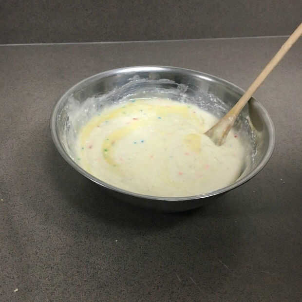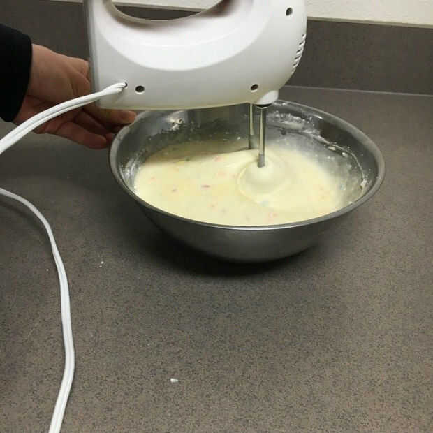 7.4. combinar la cantidad de mezcla para pastel, agua, aceite y huevos en un tazón grande.