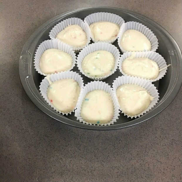 7.7. Vierta cantidades iguales de mezcla en cada hornada taza de papel.