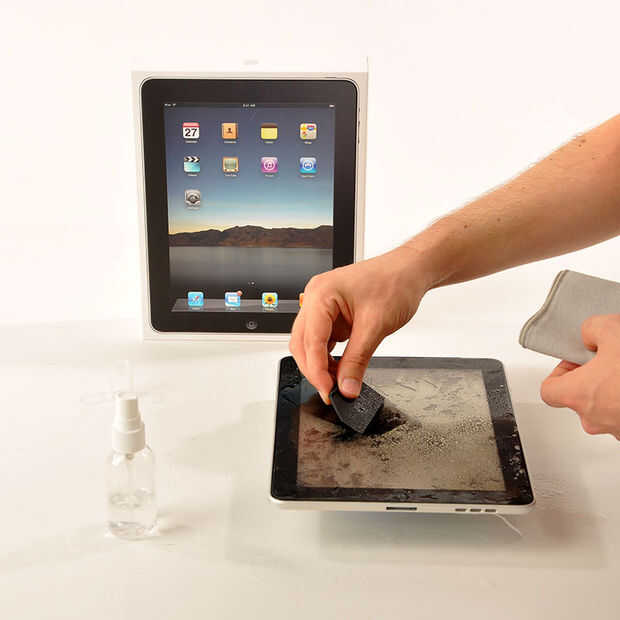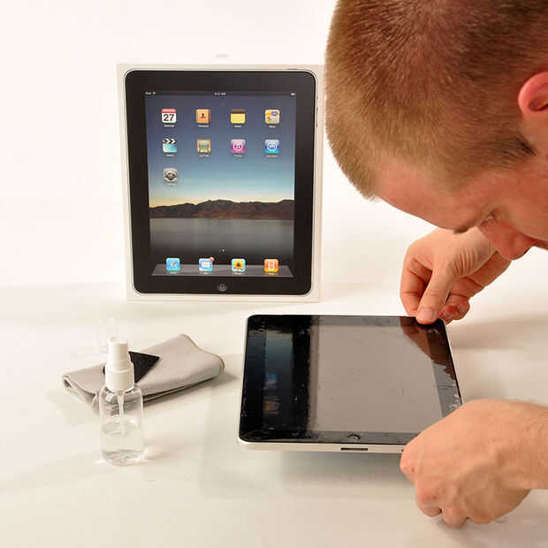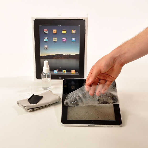 Así, convierte tu iPad limpiar la parte frontal para eliminar pelusa y repita el proceso. Mojar los dedos en primer lugar, pelar lejos el papel del forro en la parte delantera, mojando la invisibleSHIELD profusamente y luego colocando cuidadosamente hacia abajo en la pantalla de tu iPad comenzando desde la parte superior y hacia abajo. Ajuste cuidadosamente la pantalla para que sea 100% perfectamente centrada.