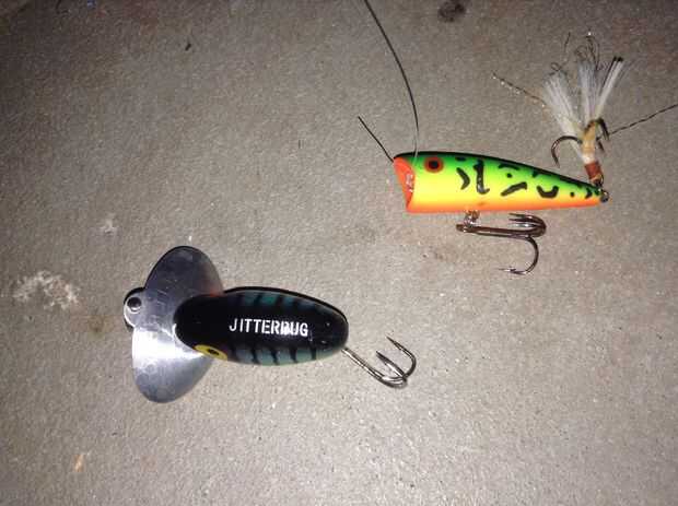 Cebos de agua superior sólo son eficaces en la madrugada. Esto hace mucho más divertido ver el salto bajo del agua de pesca. Los dos cebos que se muestra son un cebo popper y un jitter bug.