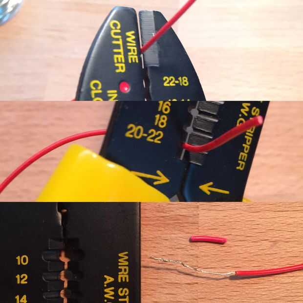 Cortar y pelar todos los cables para este proyecto. Para pelar un cable, para seleccionar el calibre adecuado (echando un vistazo el tamaño del cable) y de la abrazadera en la herramienta de desmontaje mientras tirando el cable. Esto eliminará la capa protectora de plástico dejando el cable desnudo que es capaz de conexiones de puente.