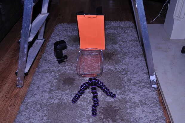 También puedes probar usando un reflector como fondo y rebotando el flash del reflector para más gamas de color en sus gotas. O tratar de colocar diferentes colores tarjeta debajo del plato de vidrio - (para mis imágenes de gota he utilizado tarjeta negra debajo de la taza de vidrio.