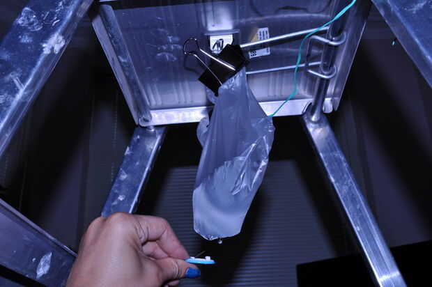 Hacer un pequeño agujero en la bolsa de agua con un perno de seguridad de la divisa, esto permite que las gotas caer en el recipiente de vidrio a un ritmo constante lento. -También puede experimentar con diferentes tamaños de agujeros para reducir o aumentar el caudal del agua.
