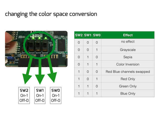 Utilizando 3 de los interruptores SW0-SW3 como entradas binarias que son 8 selecciones posibles que corresponden a las conversiones de espacio de color que están programadas.