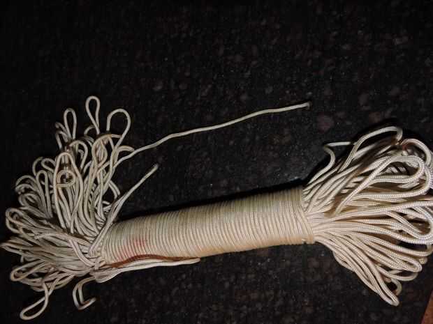 Prefiero llevar paracord 550. Es extremadamente fuerte y resistente a la abrasión. Por otra parte puede desentrañarlo y use los filamentos internos individuales (aún muy fuertes) para atar y otras tareas más pequeñas. La vaina también es muy útil e incluyendo todo lo tienes cerca de 8 veces la longitud de la cuerda que tenía después de desentrañarlo. Paracord 550 generalmente tiene 7 filamentos internos finos trenzados juntos y cubiertos por la vaina.