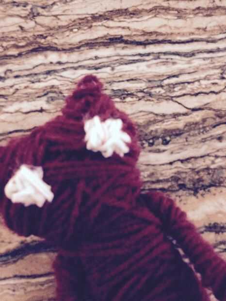 Casi hecho con Yarny! Todo lo que queda es los ojos. Para hacerlas, utilice el clip otra vez y coser en su lugar. Usted puede ser bastante caótico, los ojos miran menos cosidos de esa manera. Desea que el ojo sea una forma de almond(ish) agradable. Cuando termines con los ojos, utilice el mismo proceso para meter el flojo del hilo como hiciste con el hilo rojo.