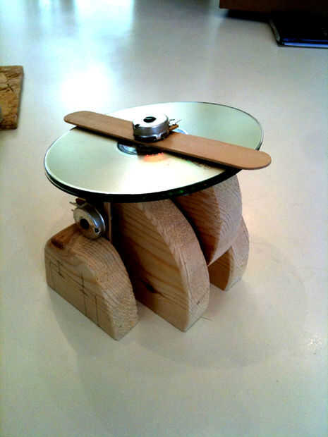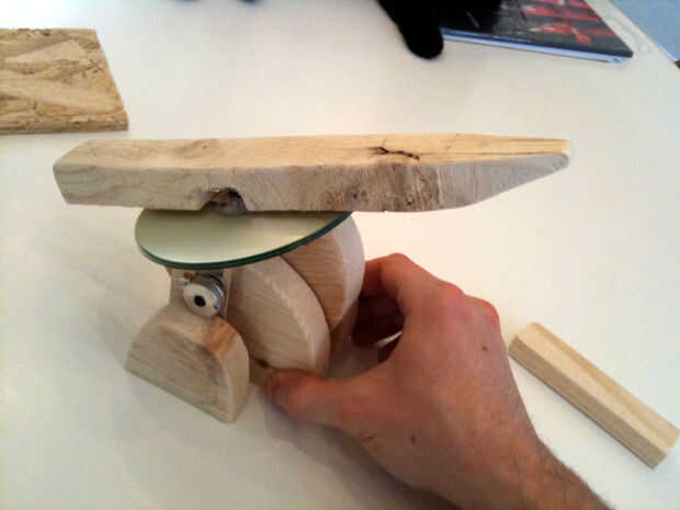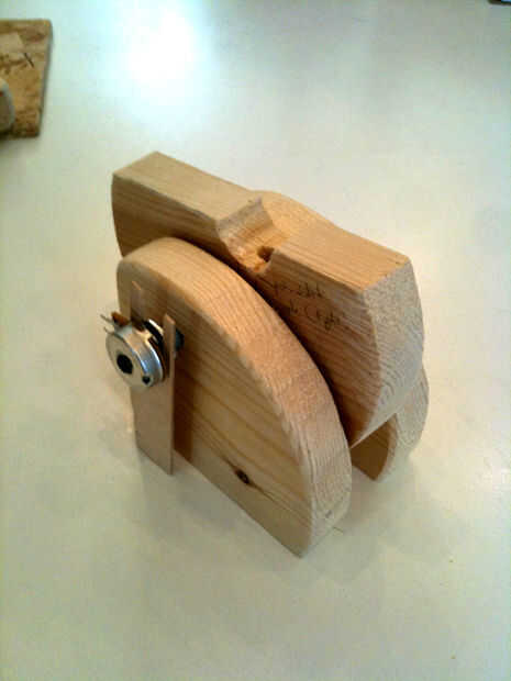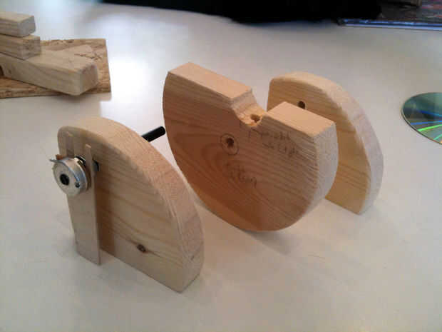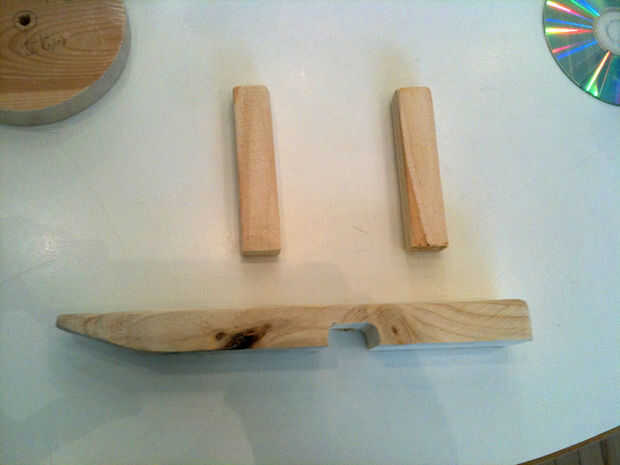 El eje se une por superglue una tercera pieza de madera (con forma de un círculo truncado) que se intercala entre las dos primeras piezas de madera. Como esta pieza casi circular gira entre sus vecinos, el eje del potenciómetro girará con ella y conocer Arduino de la elevación del puntero láser.