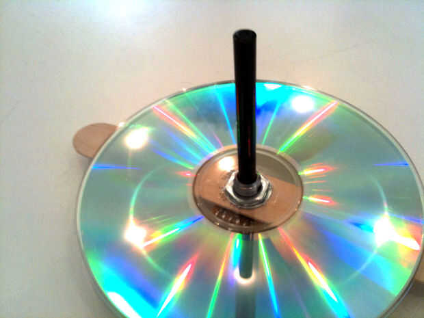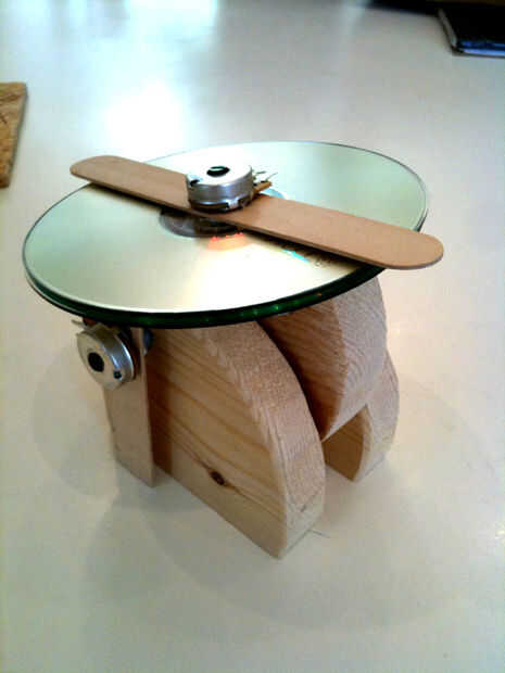 Observe la muesca semicircular poco cortada en la parte superior plana de la pieza central de madera. Hay un agujero perforado hacia abajo en la base de esa muesca justo lo suficientemente amplio como para eje de potenciómetro caber dentro. El segundo potenciómetro eventualmente se pega en el agujero, pero primero se une a otro depresor de lengua. Dos discos actúan como un cojinete entre el taco de madera y el depresor de lengua. Una vez que el potenciómetro se pega en su lugar, actúa como un sensor para la rotación lateral del puntero láser.