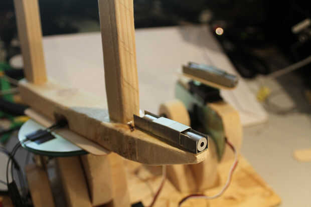 Con la base de dos ejes montada, un mango de pistola-como simple (hecho de tres trozos de madera pegado) se une a la parte superior. Esto permitirá que para el control simple de mano uno o dos de la torreta del sensor.
