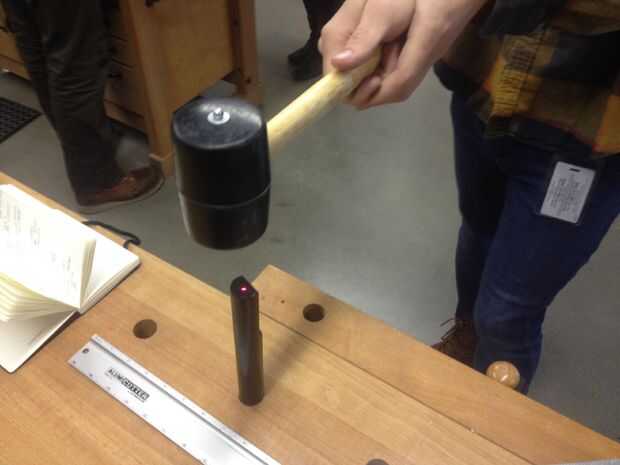 La idea vino a mí en un flash mientras trabajaba en el taller 9 Pier en San Francisco. La mayoría de las herramientas ya tiene guías laser de estos días. Sólo costura extraño que el martillo había dejado de tener su propio punto brillante ayudando al usuario saber dónde estaba el final del negocio de la herramienta a tierra. Combina la precisión de un láser digital con la potencia bruta de un martillo es una combinación natural.
