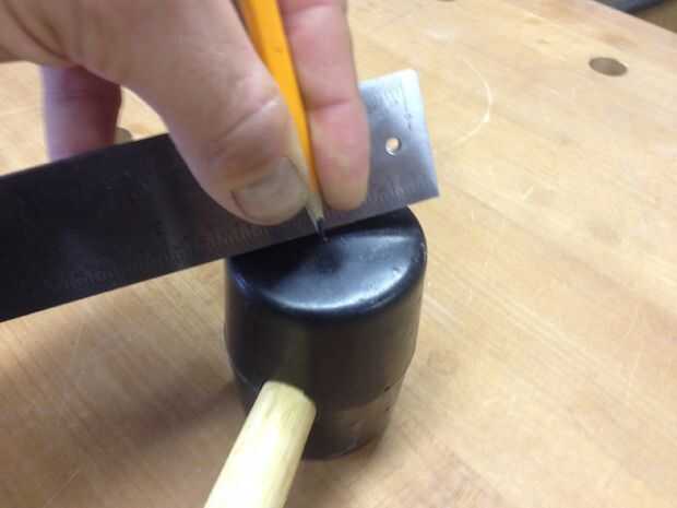 Para conseguir un punto láser exactamente donde el martillo va a huelga necesitamos perforar un orificio hacia abajo del mazo. Para hacer esto con precisión utilice una regla para encontrar el centro del martillo. Use un lápiz para marcar donde está el centro de la cara.