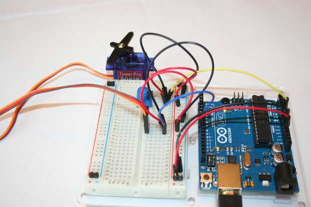 el potenciómetro se conecta en el A0 entrada analógica, y el Servo esté conectado en el pin de datos 9. Lee el cambio de voltaje causado por el potenciómetro a Dile el servo en qué posición debe estar en.